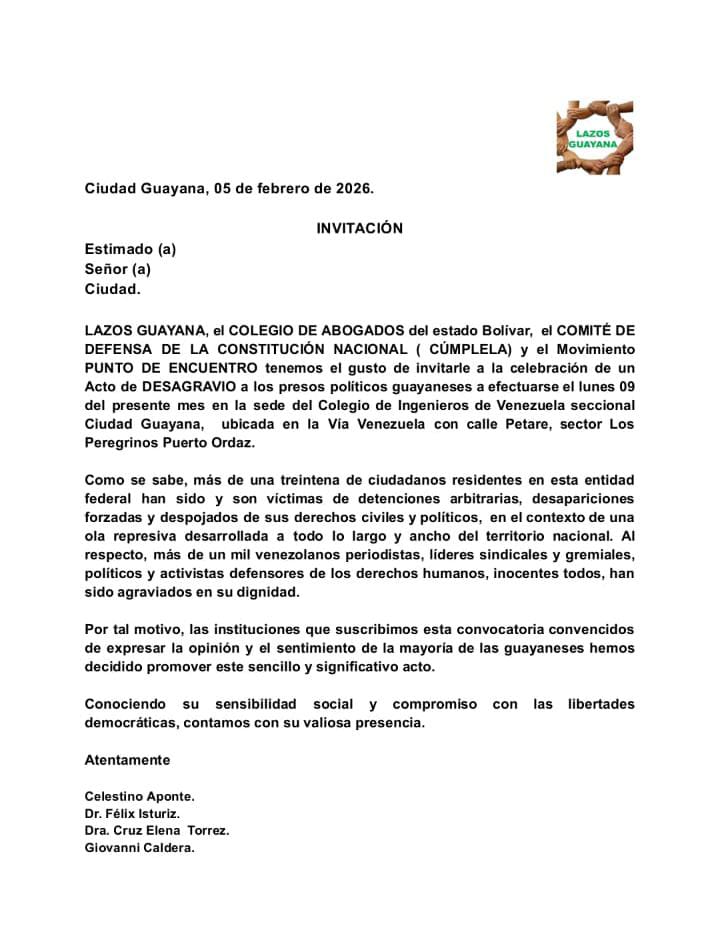 Inicio Destacados ACTO DE DESAGRAVIO A LOS PRESOS POLITICOS GUAYANESES… DestacadosPolítica ACTO DE DESAGRAVIO A LOS PRESOS POLITICOS GUAYANESES… Por Editor - febrero 6, 2026 6 0 FacebookTwitterPinterestWhatsApp