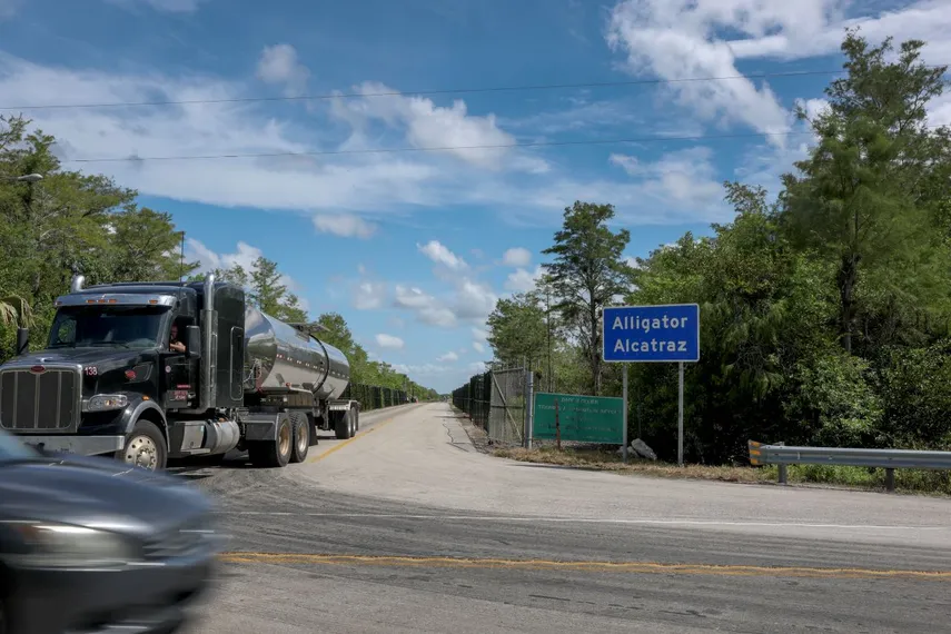 Un camión con combustible sale de «Alligator Alcatraz» en el Aeropuerto de Entrenamiento y Transición Dade-Collier el 10 de julio de 2025 en Ochopee, Florida.