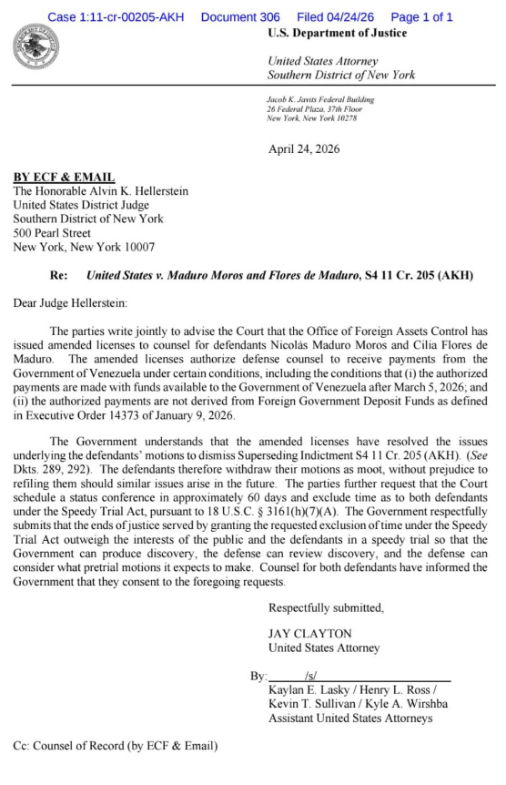 Estados Unidos ha accedido a modificar las sanciones a Venezuela para permitir que el Ejecutivo venezolano pague los honorarios de los abogados que defienden al líder venezolano Nicolás Maduro y a su esposa, Cilia Flores, en el proceso por narcotráfico que afrontan en Nueva York, según un documento judicial.