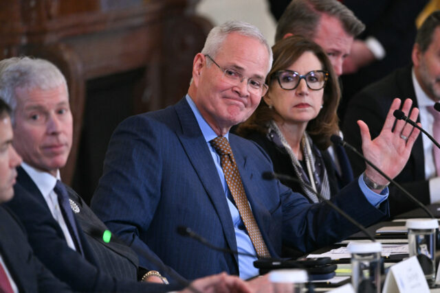 ExxonMobil CEO Darren Woods (C) attends a meeting with US President Donald Trump and oil company executives in the East Room of the White House in Washington, DC on January 9, 2026. President Trump is aiming to convince oil executives to support his plans in Venezuela, a country whose energy resources he says he expects to control for years to come. US forces seized Venezuelan president Nicolas Maduro in a sweeping military operation on January 3, with Trump making no secret that control of Venezuela's oil was at the heart of his actions. (Photo by Brendan SMIALOWSKI / AFP)