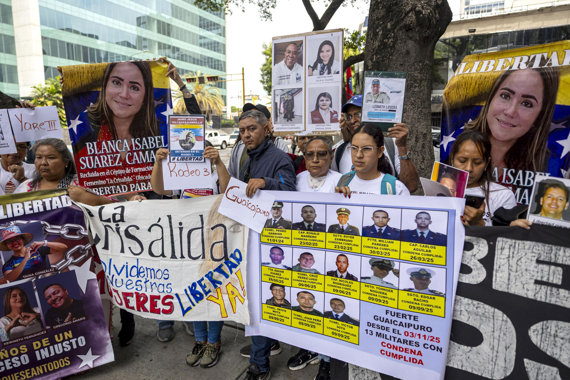 AME5630. CARACAS (VENEZUELA), 19/03/2026.- Personas sostienen carteles durante una manifestación este jueves, en Caracas (Venezuela). Familiares de presos políticos protestaron ante el Ministerio para el Servicio Penitenciario de Venezuela con el objetivo de exigir el cese de las "torturas" a las que son sometidos sus parientes en las cárceles por parte, aseguraron, de funcionarios de la Dirección General de Contrainteligencia Militar (DGCIM). EFE/ Miguel Gutiérrez