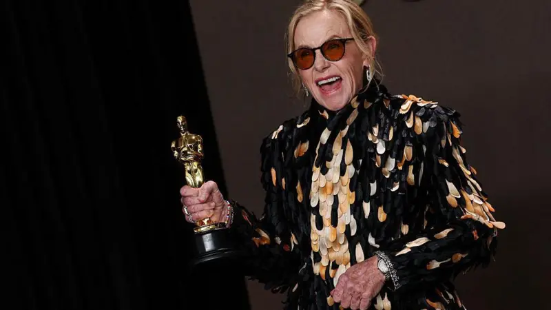 Pie de foto,Kate Hawley, al recibir el Oscar al mejor diseño de vestuario por Frankenstein, se dirigió al director de la cinta y le dijo: «Guillermo (del Toro), gracias. Todas nuestras nominaciones son tus nominaciones».