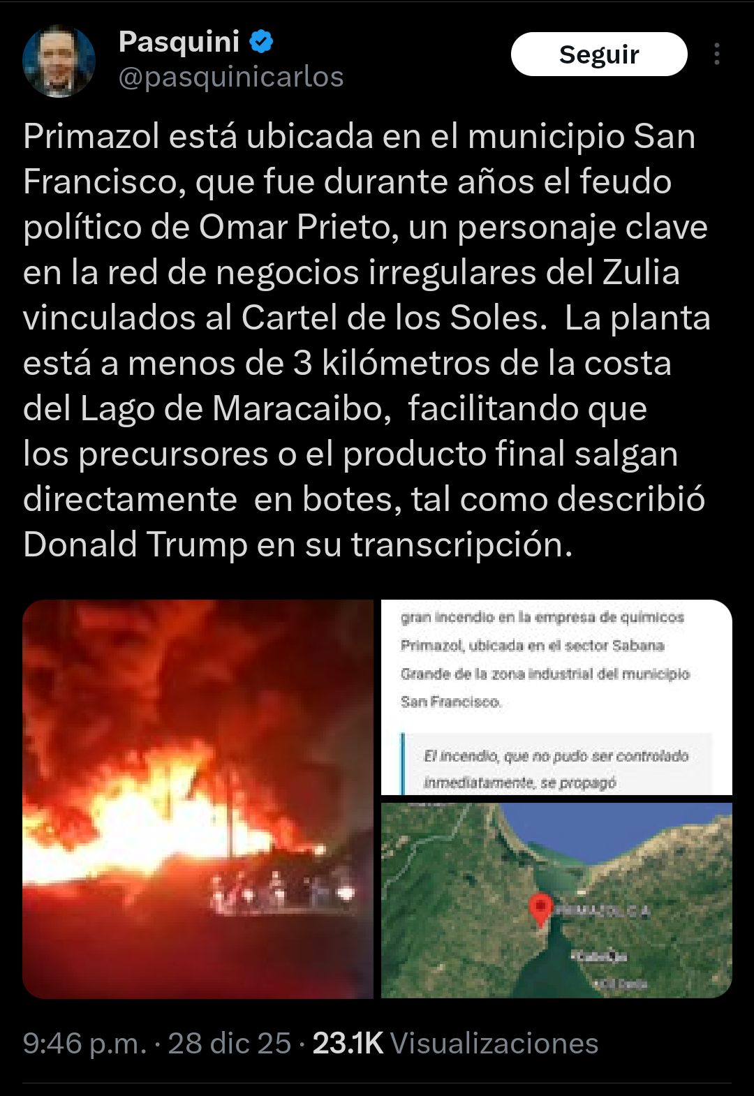 Sus declaraciones fueron vinculadas con un incendio en galpones de la empresa de productos químicos, Primazol, ubicada en la zona industrial del municipio San Francisco, estado Zulia, durante la madrugada del 24 de diciembre, que fue controlado por bomberos de la zona. Tras las declaraciones de Trump, la empresa emitió tres comunicados, dos este 29 de diciembre y uno al día siguiente.